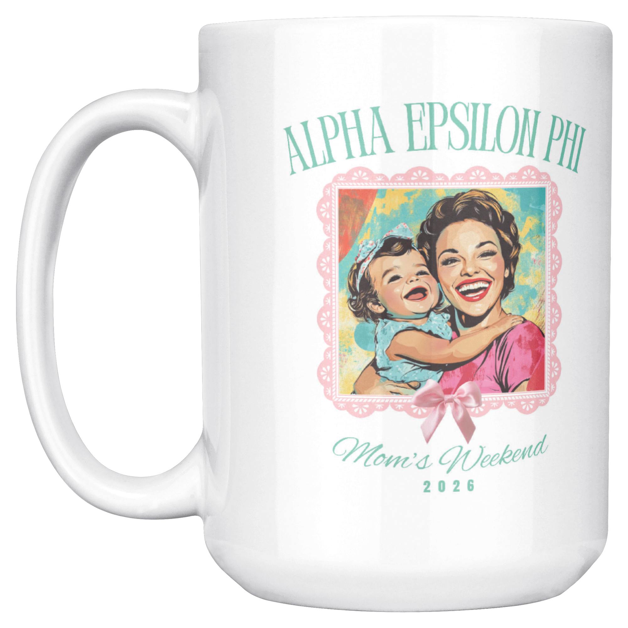 Show your sorority mom pride with this high quality 15oz ceramic white mug with a darling vintage mom's weekend design for each sorority. This is great to have for Mom's Weekends and more to keep your beverage hot or cold while enjoying some quality Mom and Daughter time!