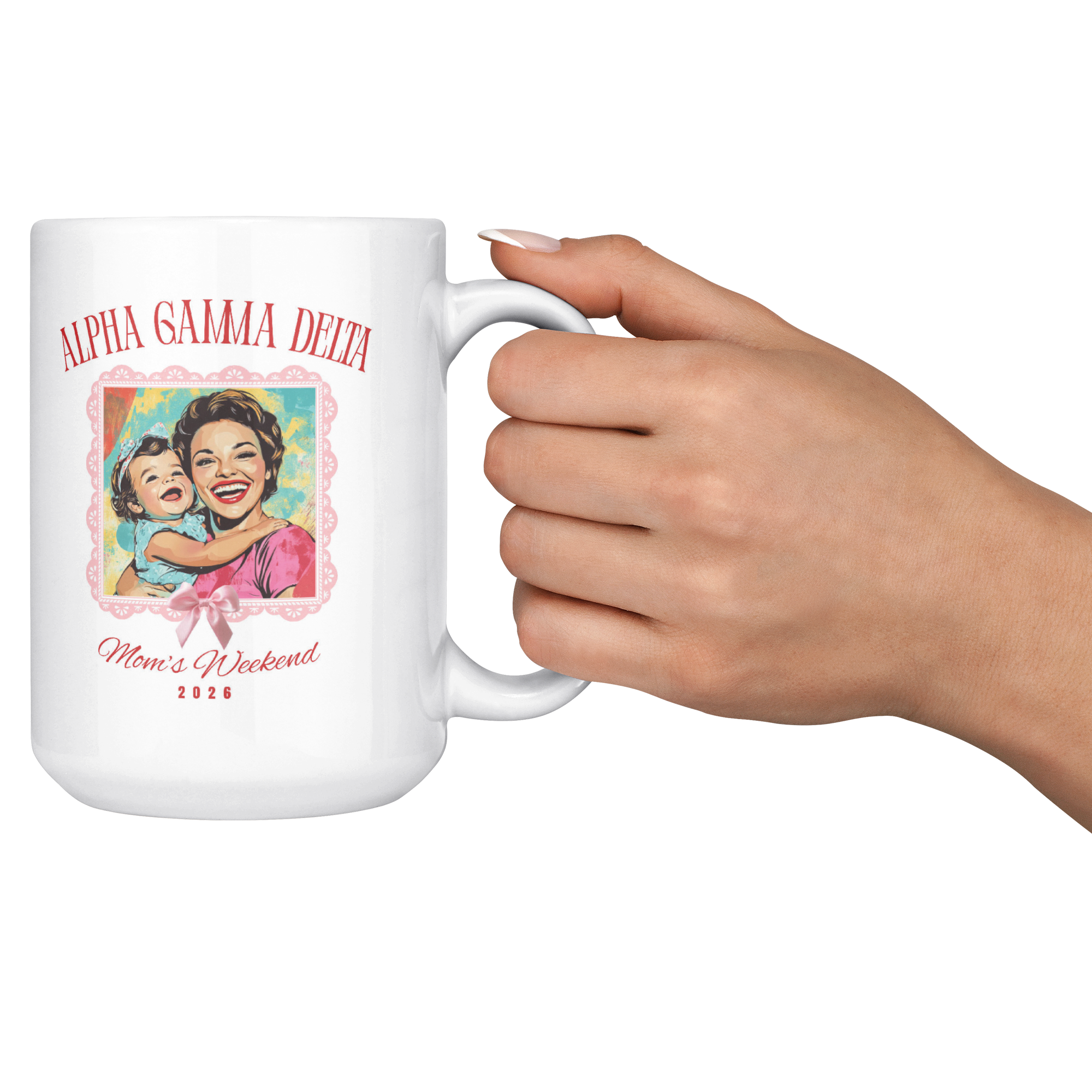 Show your sorority mom pride with this high quality 15oz ceramic white mug with a darling vintage mom's weekend design for each sorority. This is great to have for Mom's Weekends and more to keep your beverage hot or cold...