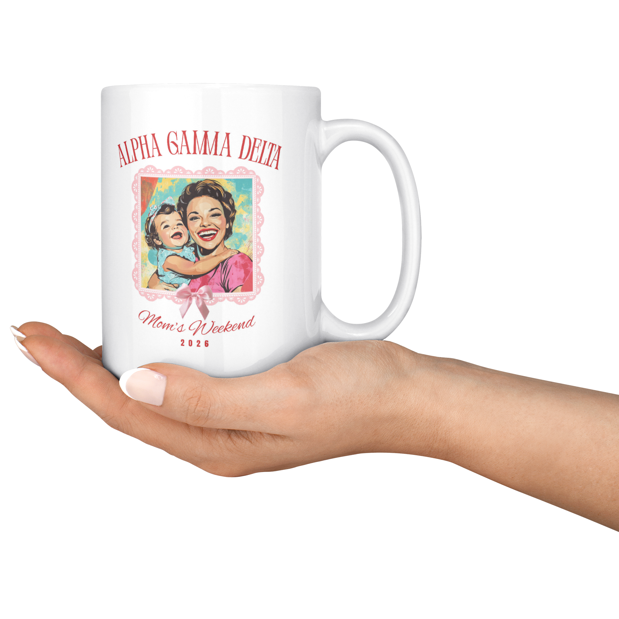 Show your sorority mom pride with this high quality 15oz ceramic white mug with a darling vintage mom's weekend design for each sorority. This is great to have for Mom's Weekends and more to keep your beverage hot or cold while enjoying some quality Mom and Daughter time!