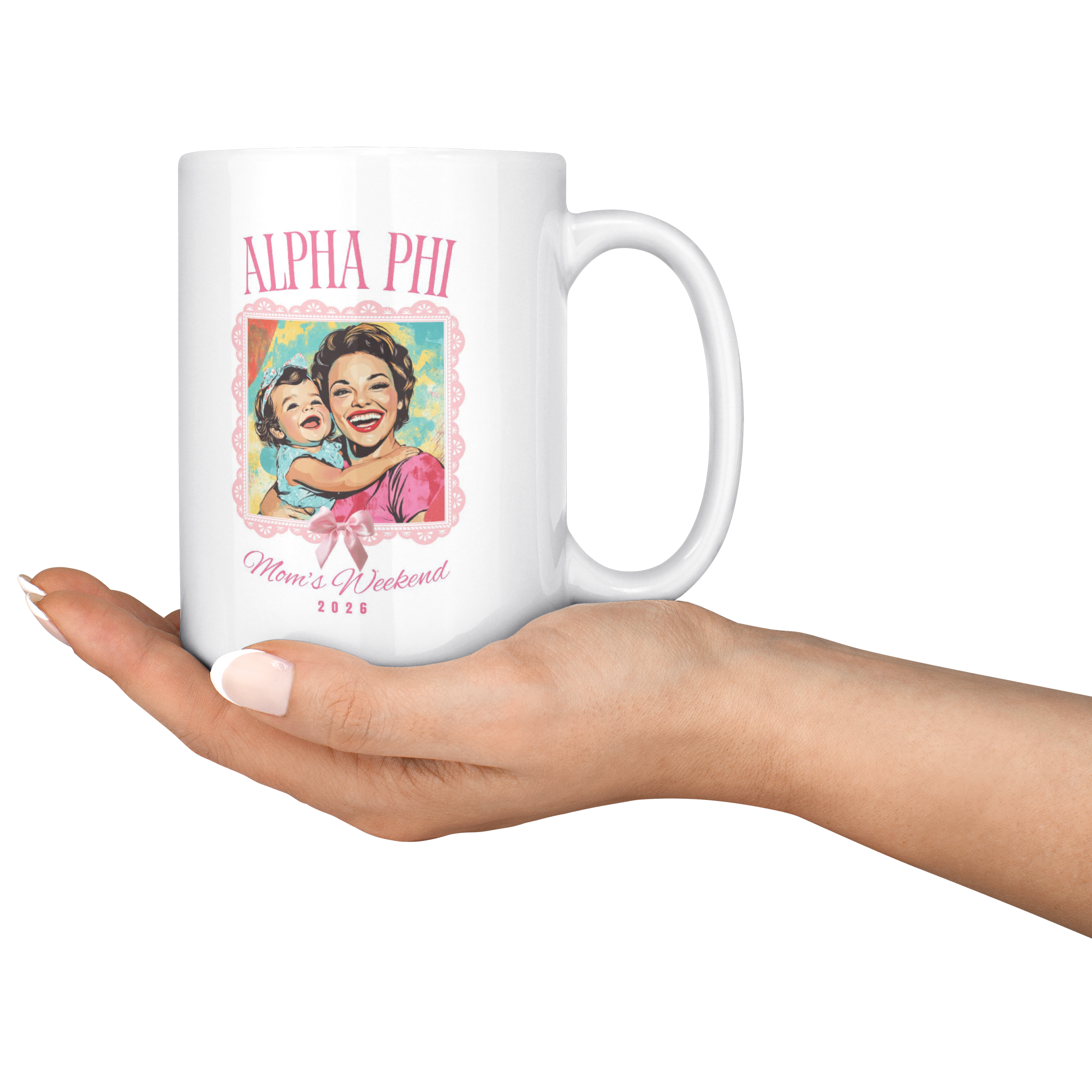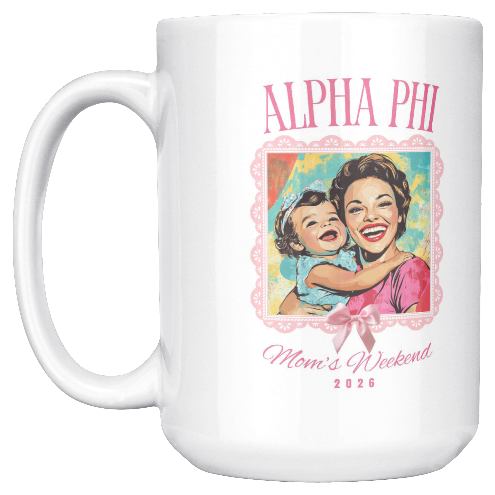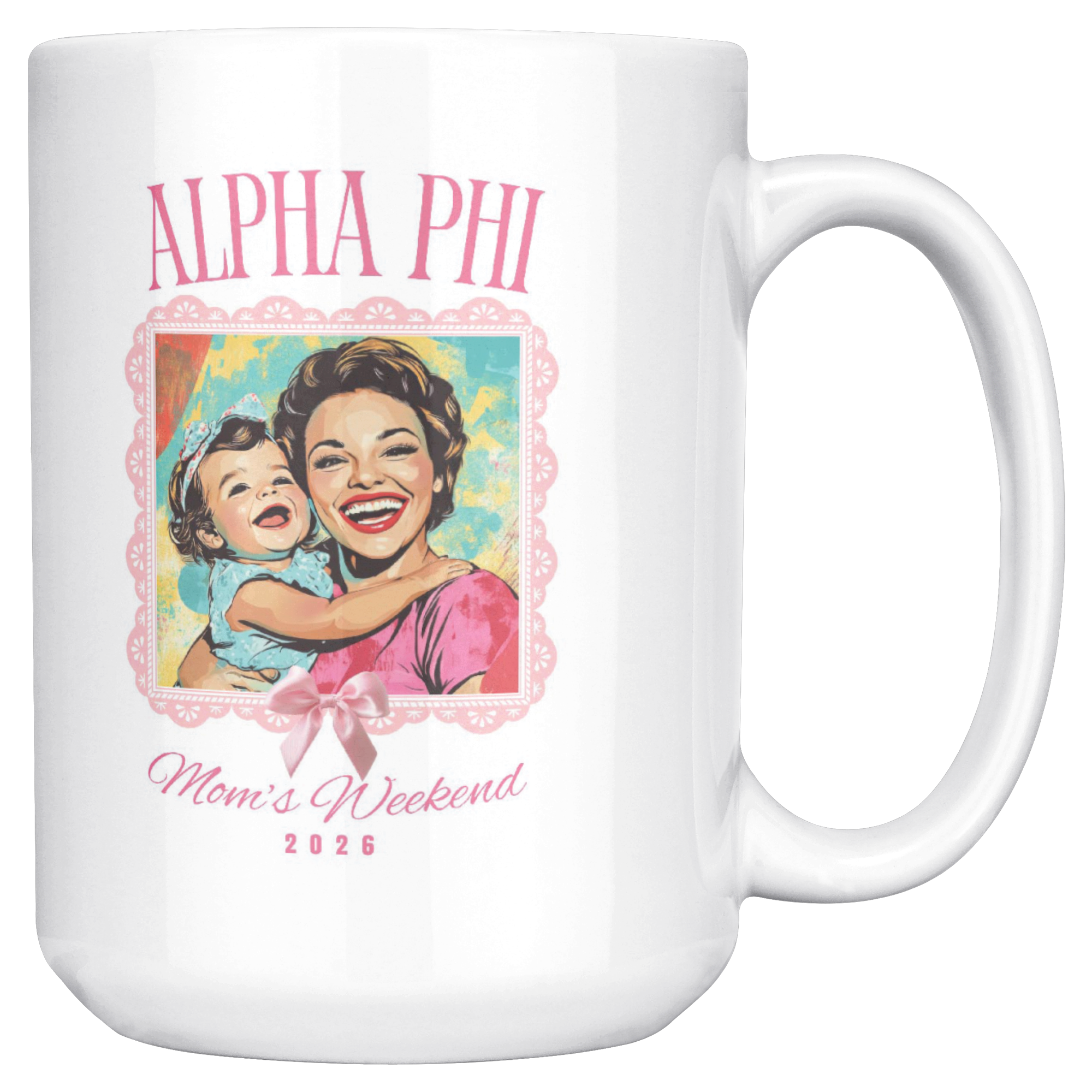 Show your sorority mom pride with this high quality 15oz ceramic white mug with a darling vintage mom's weekend design for each sorority. This is great to have for Mom's Weekends and more to keep your beverage hot or cold...
