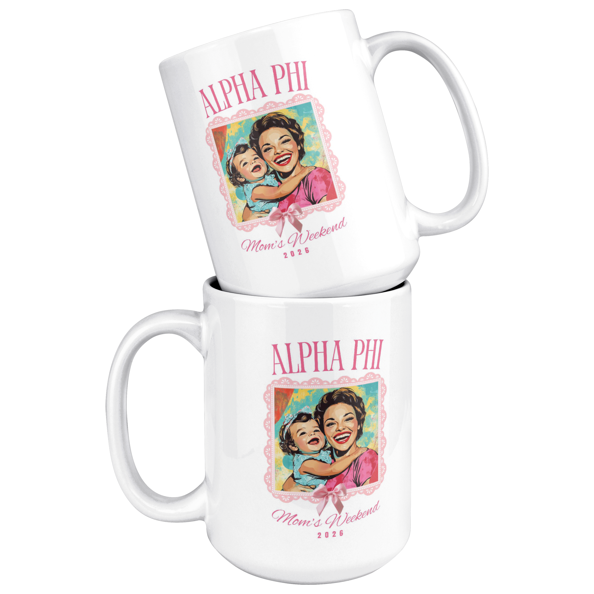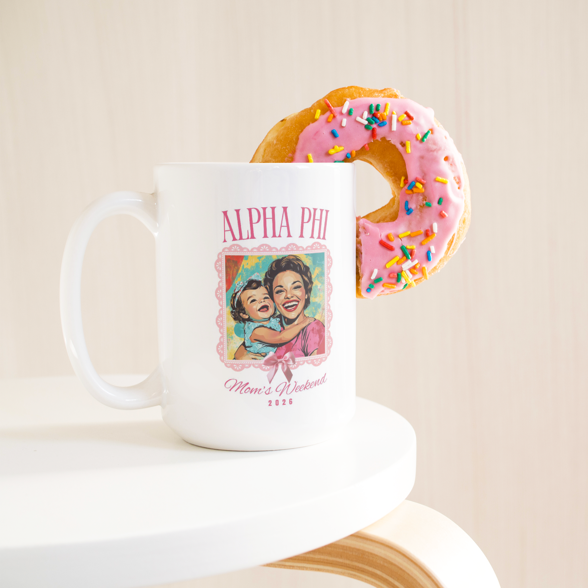 Show your sorority mom pride with this high quality 15oz ceramic white mug with a darling vintage mom's weekend design for each sorority. This is great to have for Mom's Weekends and more to keep your beverage hot or cold while enjoying some quality Mom and Daughter time!