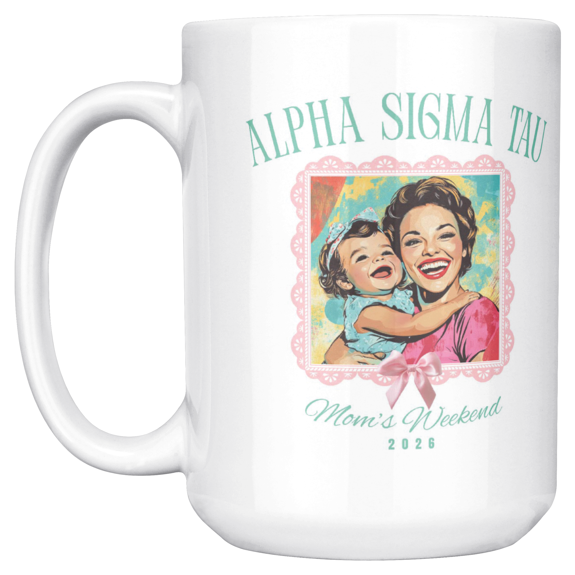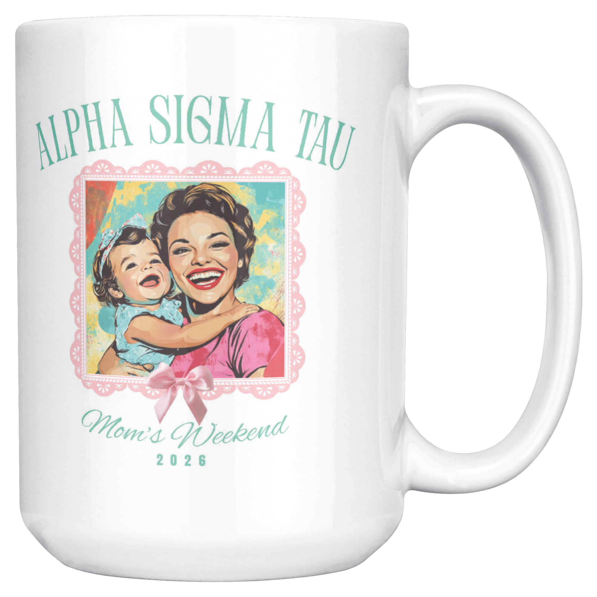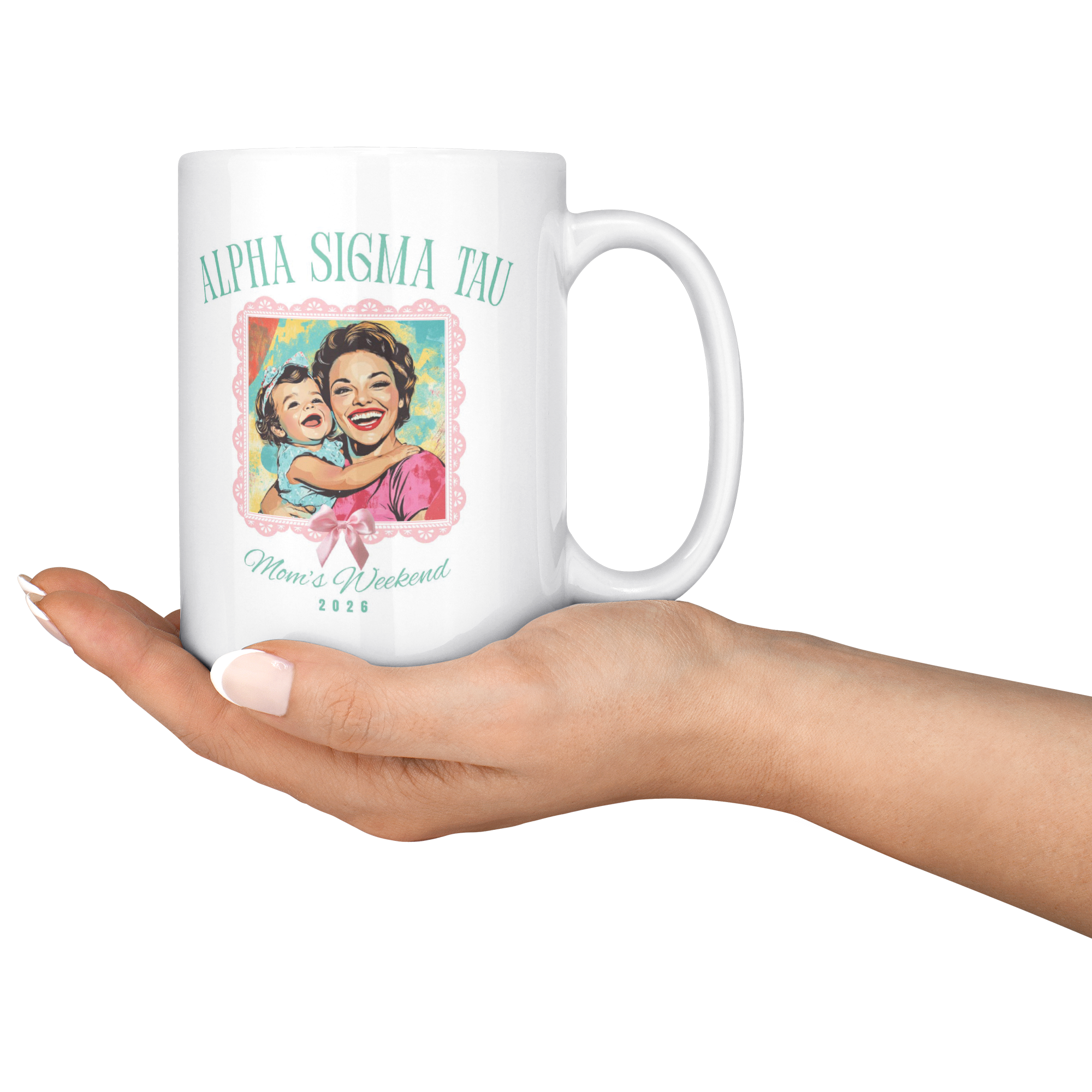 Show your sorority mom pride with this high quality 15oz ceramic white mug with a darling vintage mom's weekend design for each sorority. This is great to have for Mom's Weekends and more to keep your beverage hot or cold while enjoying some quality Mom and Daughter time!