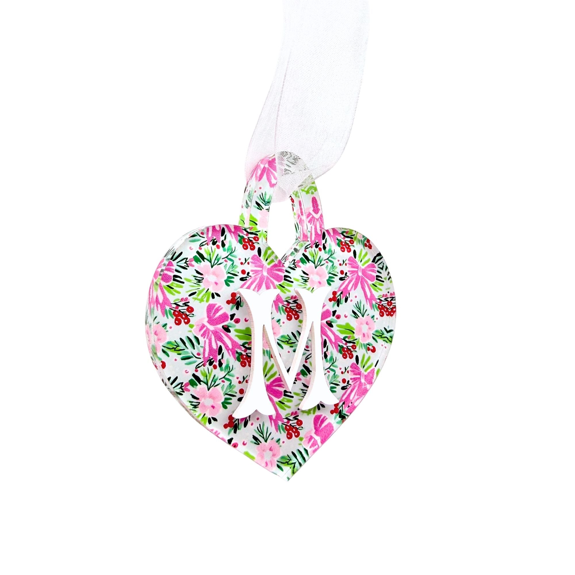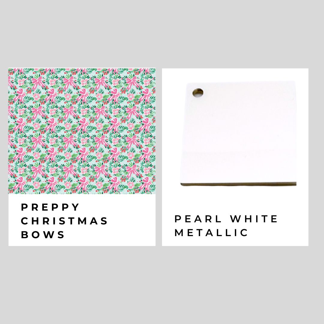 Deck the halls with personalized style! This delightful 3"x3" acrylic ornament gets a custom touch with your monogram or initials layered on top, then finished with a charming white organza ribbon. Pick your vibe—go preppy with festive Christmas trees or bows—then choose your acrylic letter style: shimmering Metallic Pearl White on cheerful patterns, or glamorous Gold Mirror letters on sleek Silver Mirror. A gift that'll sparkle on the tree year after year.