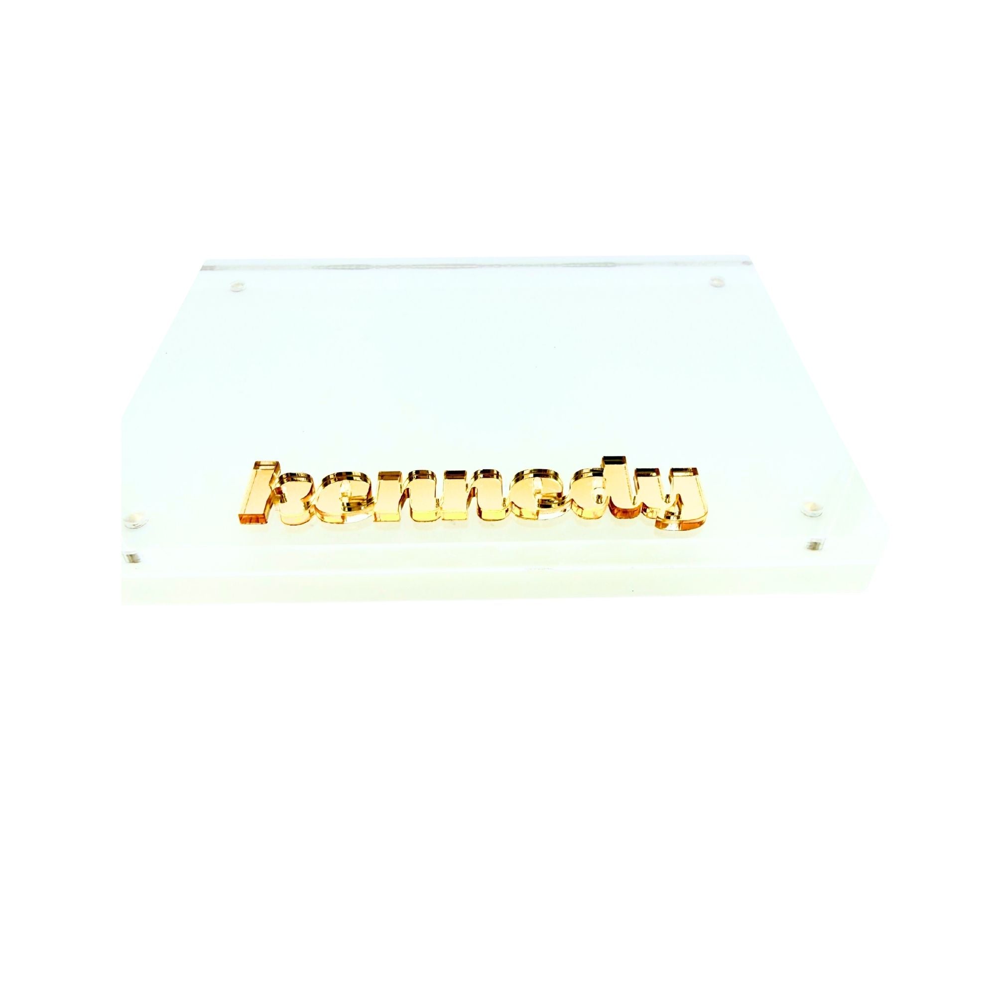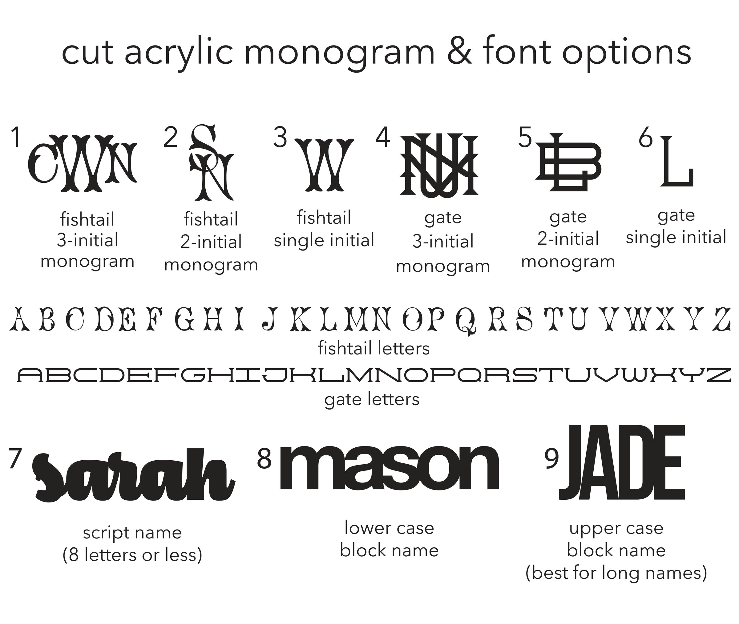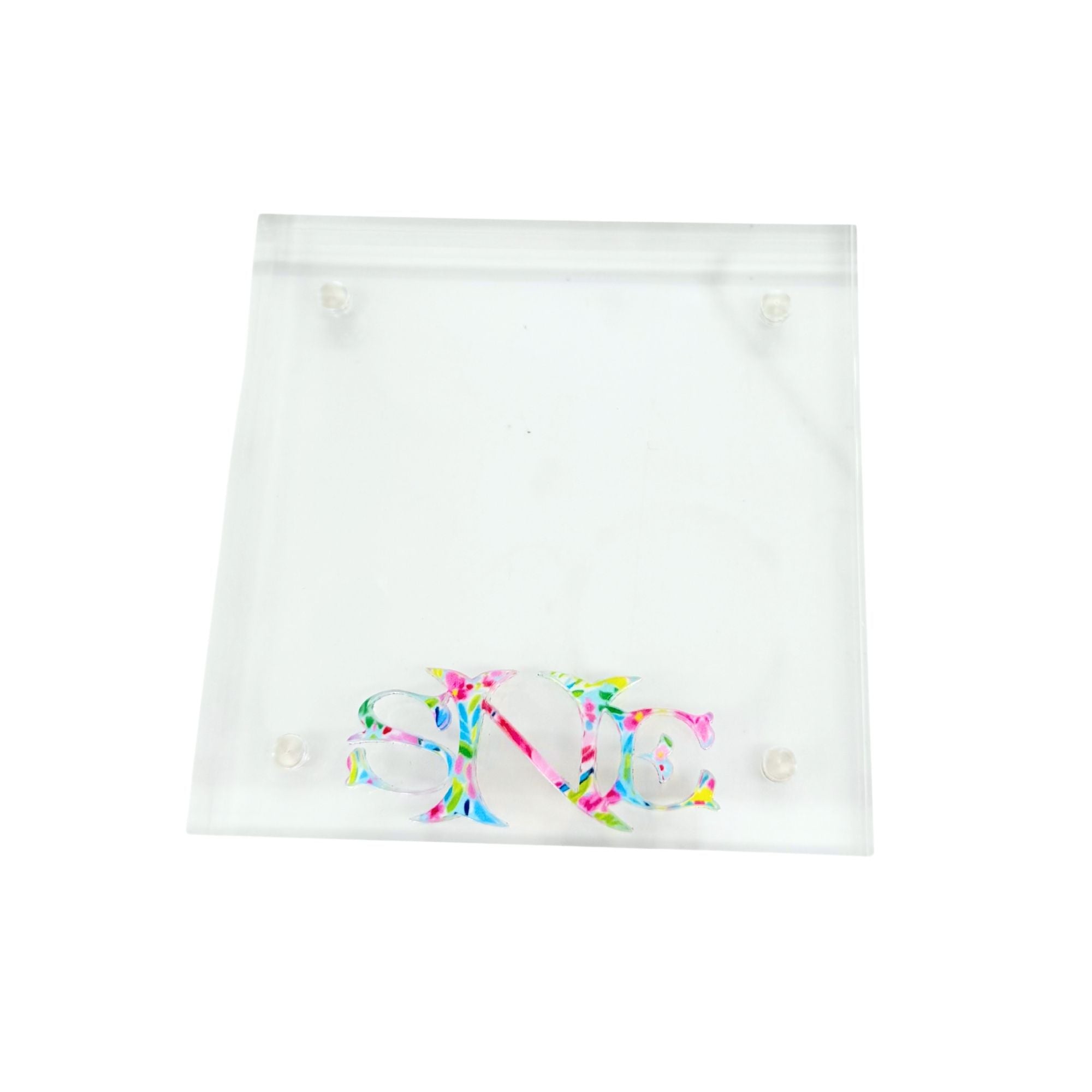 These clear acrylic frames are available in a variety of sizes with your choice of eye-catching patterns or sleek solid colors for the monogram, name or initials - (refer to the acrylic color/pattern swatch image) and enter your choice in the "add personal message" box, choose from the menu for size of frame and monogram style (refer to the cut acrylic monogram and font options image).