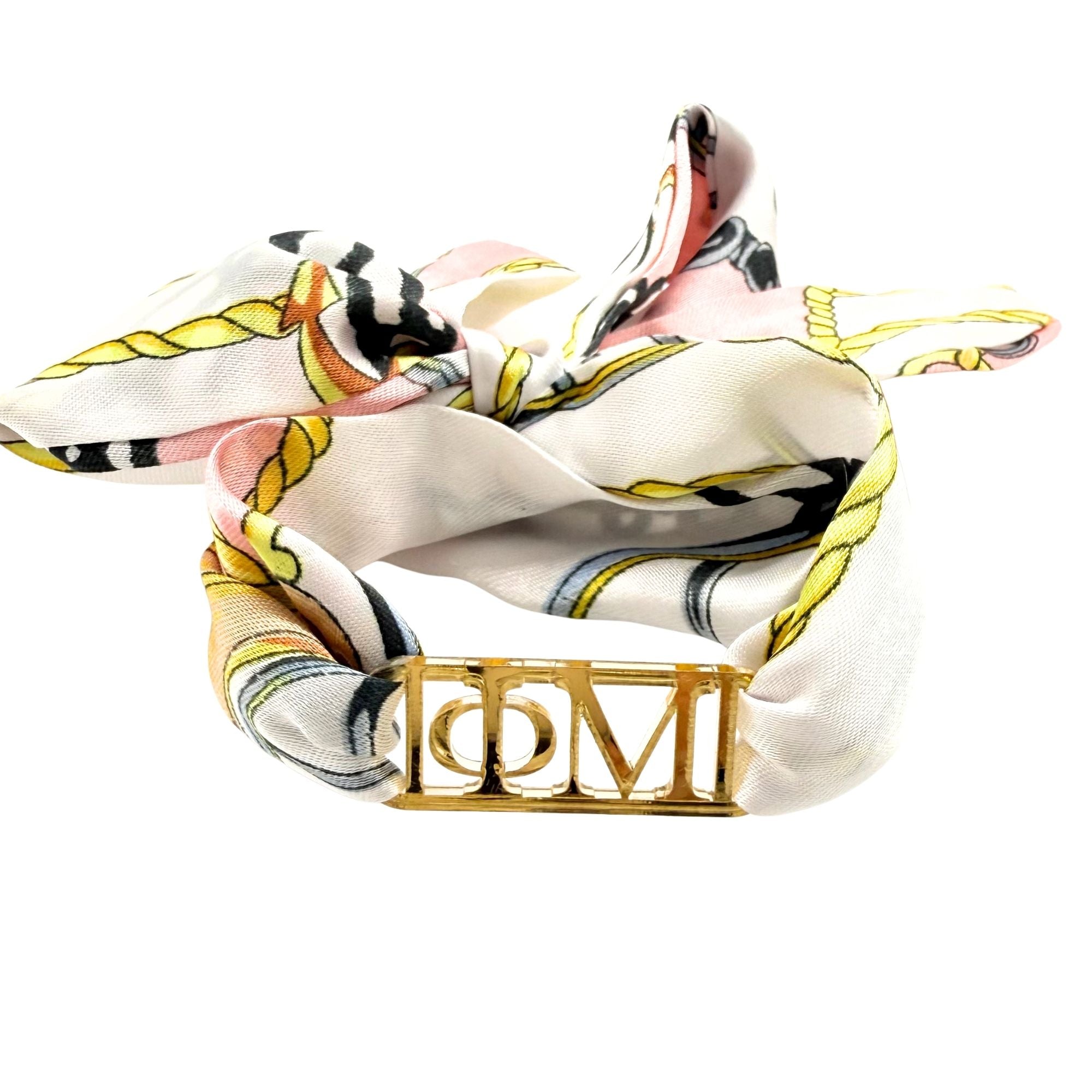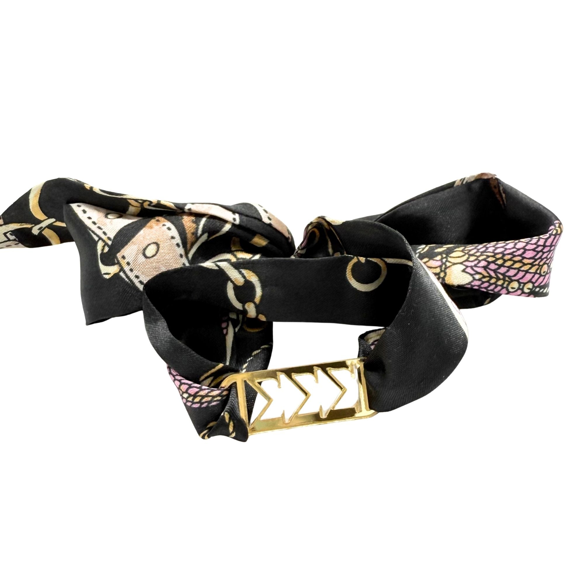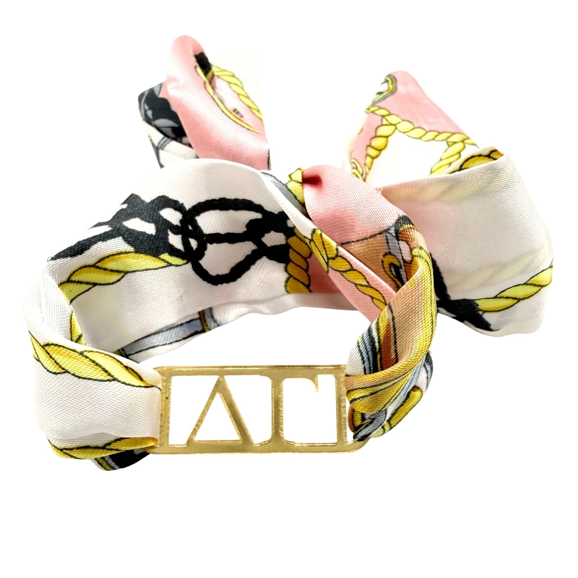 Add a chic touch of sisterhood style with this Tie Scarf featuring a mirrored gold acrylic Greek letter slide. Wrap this darling Tie Scarf around your wrist, hat, bag, belt loop, boots, wear as a headband and more! Show off your sorority pride in fun, creative ways—whether you're heading to a chapter event or just adding flair to your everyday look with this playful, eye-catching piece made just for sisters! This makes a wonderful gift for Bid Day, BIG LIL (see our BIG LIL tie scarf listing), Initiation and more!