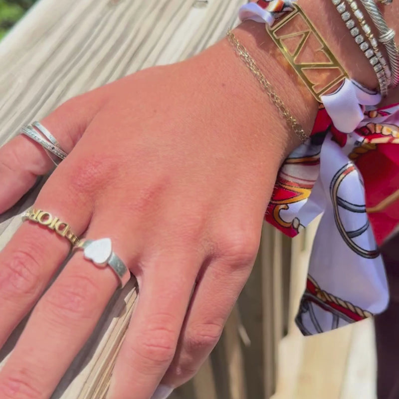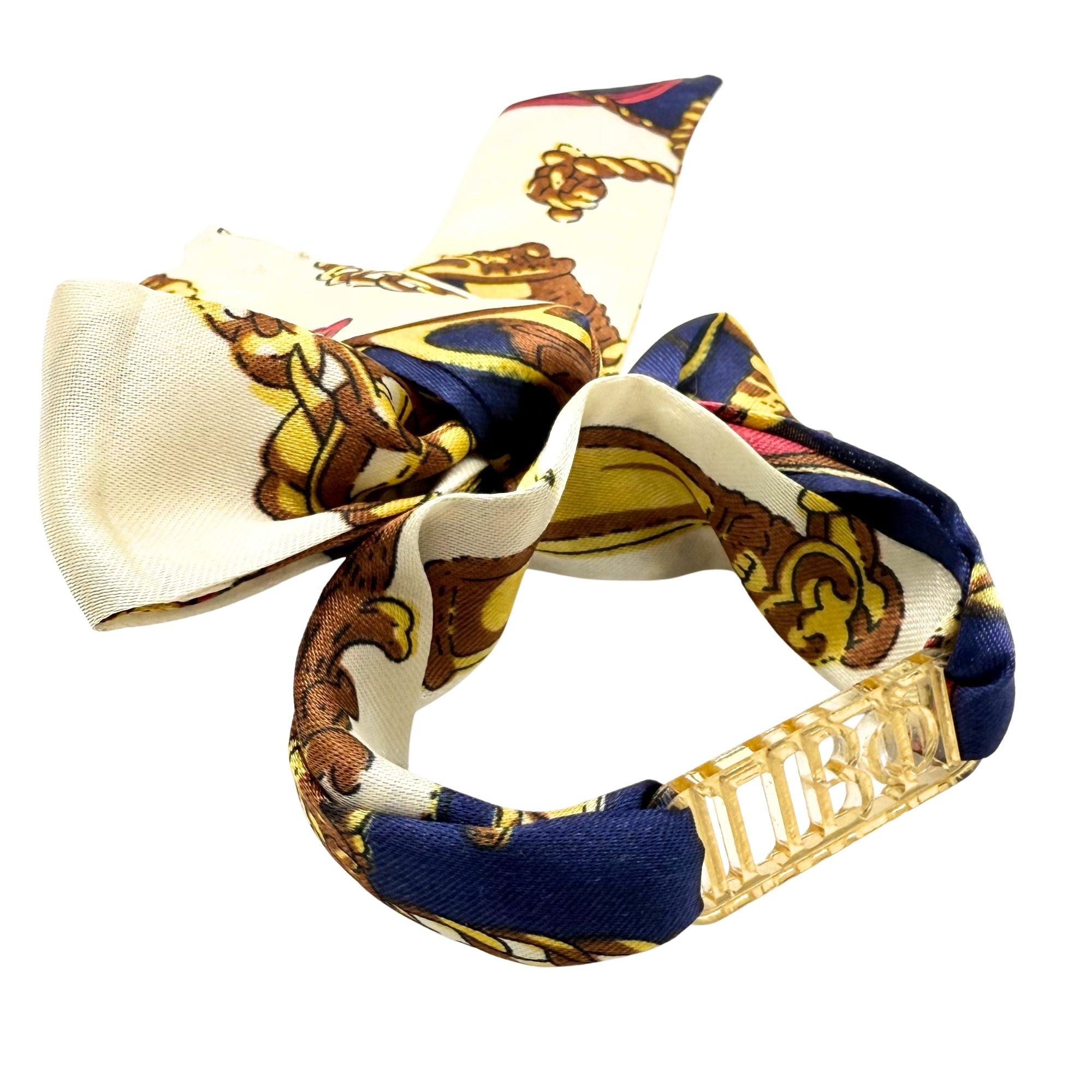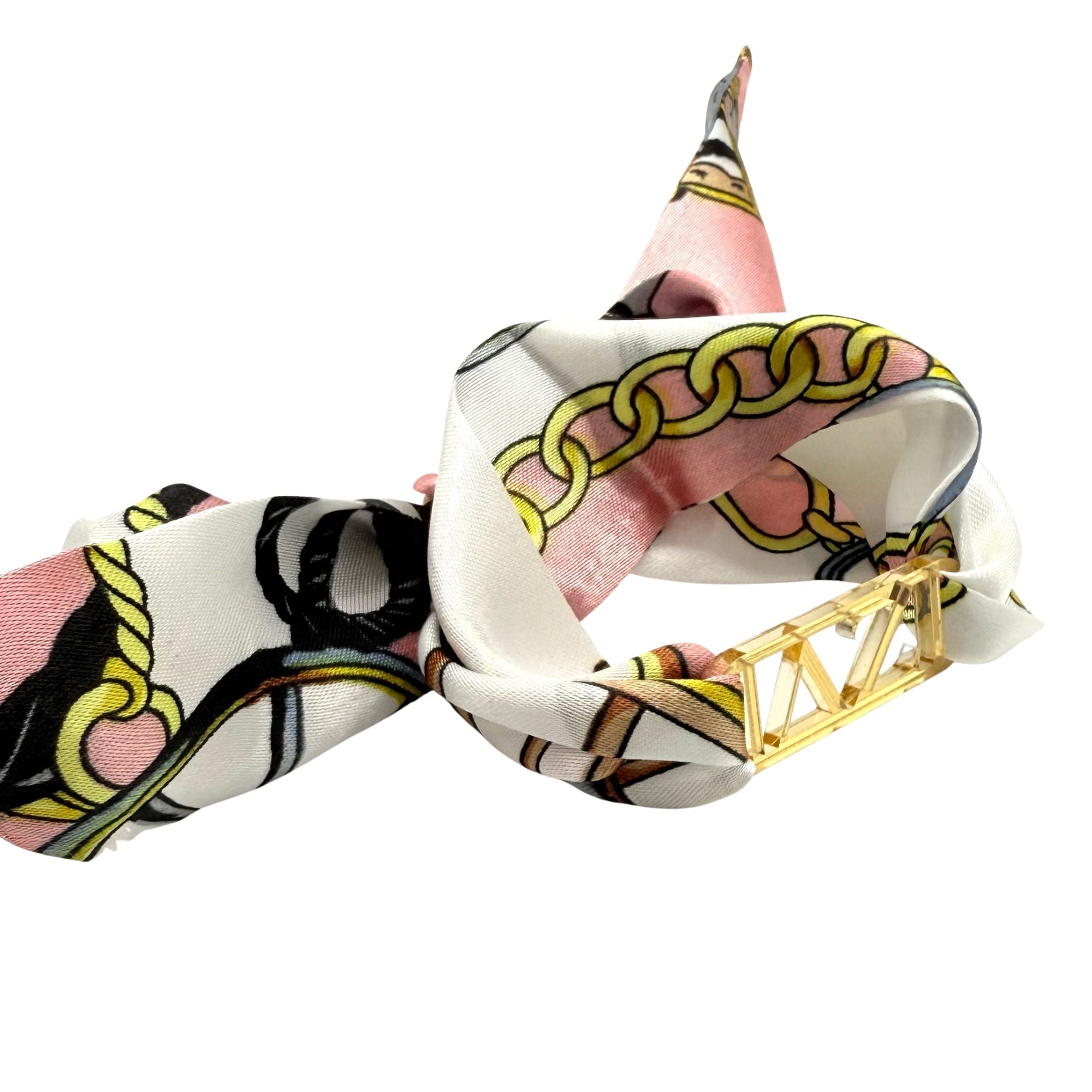 Add a chic touch of sisterhood style with this Tie Scarf featuring a mirrored gold acrylic Greek letter slide. Wrap this darling Tie Scarf around your wrist, hat, bag, belt loop, boots, wear as a headband and more! Show off your sorority pride in fun, creative ways—whether you're heading to a chapter event or just adding flair to your everyday look with this playful, eye-catching piece made just for sisters! This makes a wonderful gift for Bid Day, BIG LIL (see our BIG LIL tie scarf listing), Initiation and more!