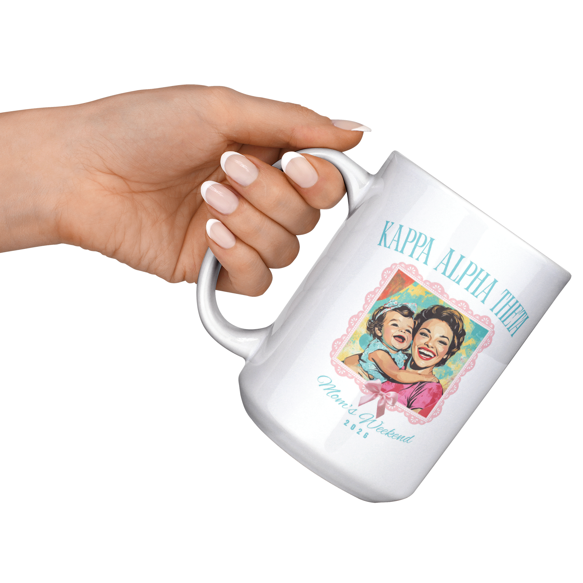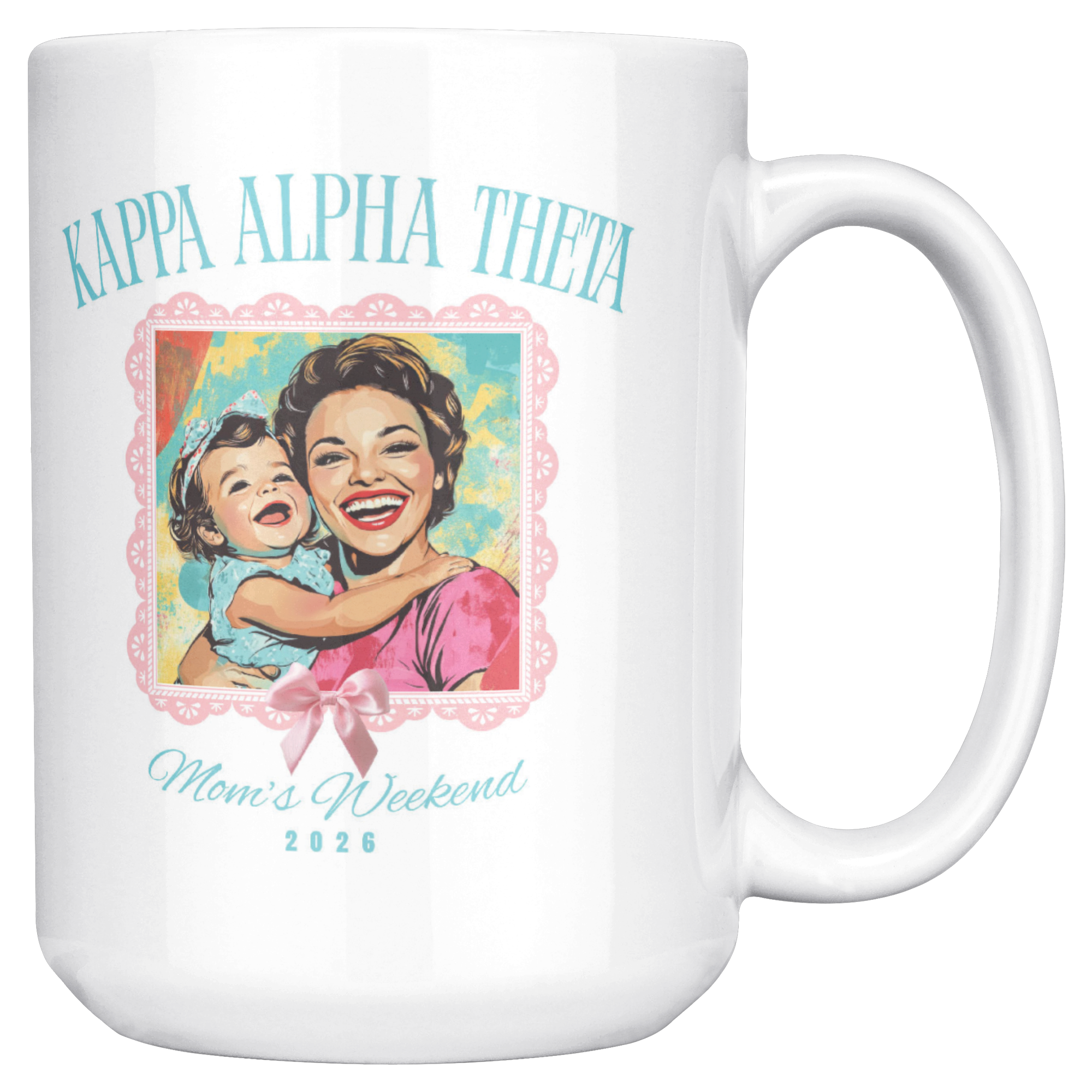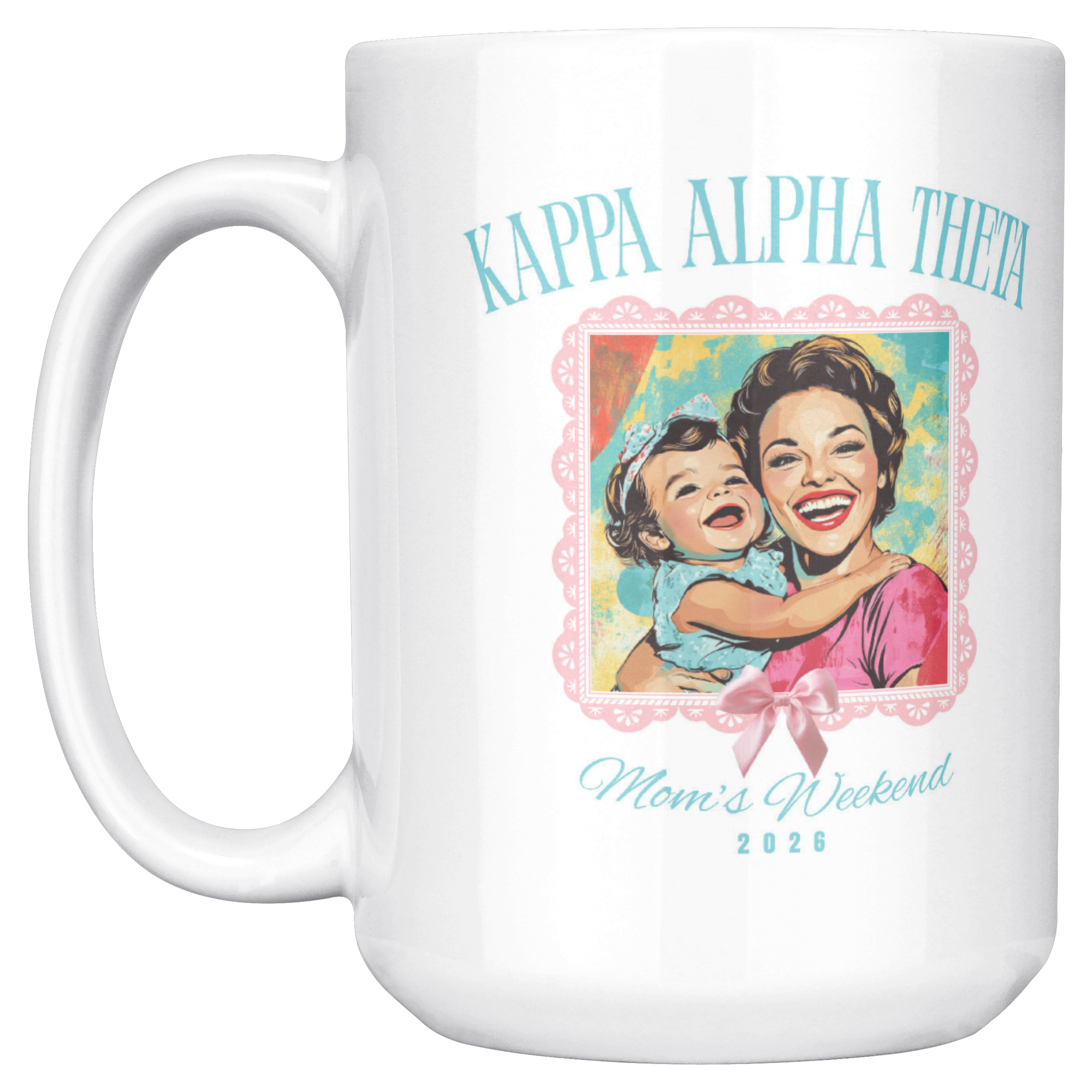 Show your sorority mom pride with this high quality 15oz ceramic white mug with a darling vintage mom's weekend design for each sorority. This is great to have for Mom's Weekends and more to keep your beverage hot or cold while enjoying some quality Mom and Daughter time!