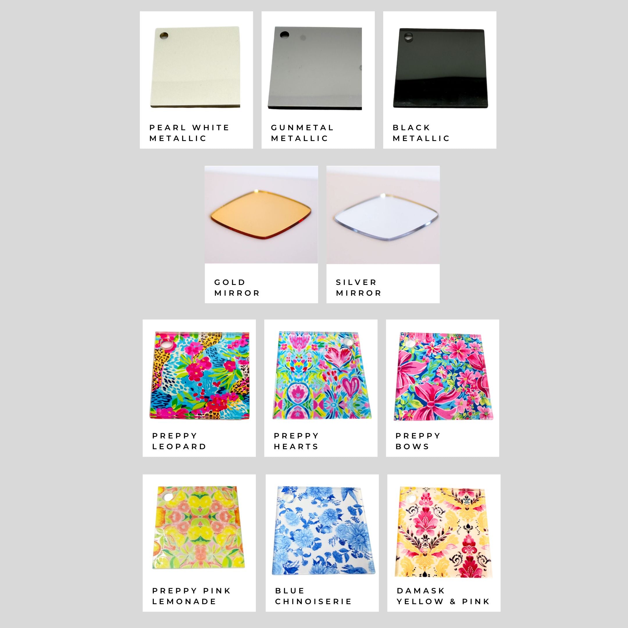 For a different color combo (for the monogram on top of the ornament) choosing from the acrylic patterns/colors shown, please enter in the "Add Personal Message" box what color or pattern you want the monogram to be.