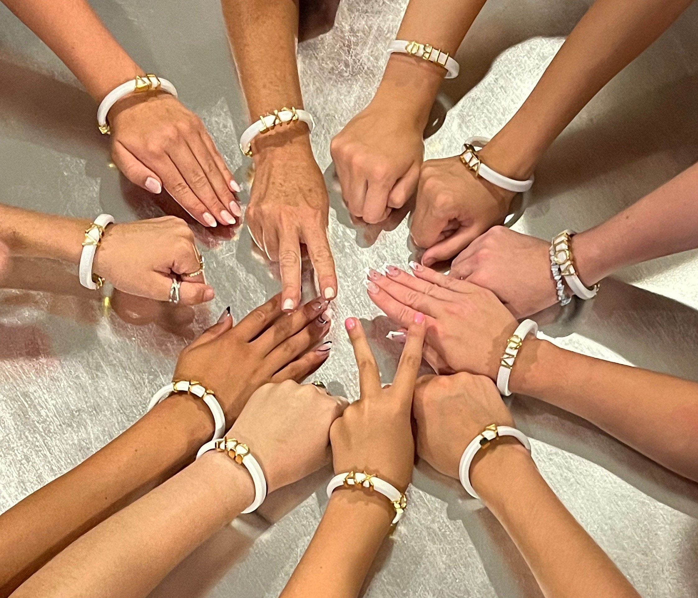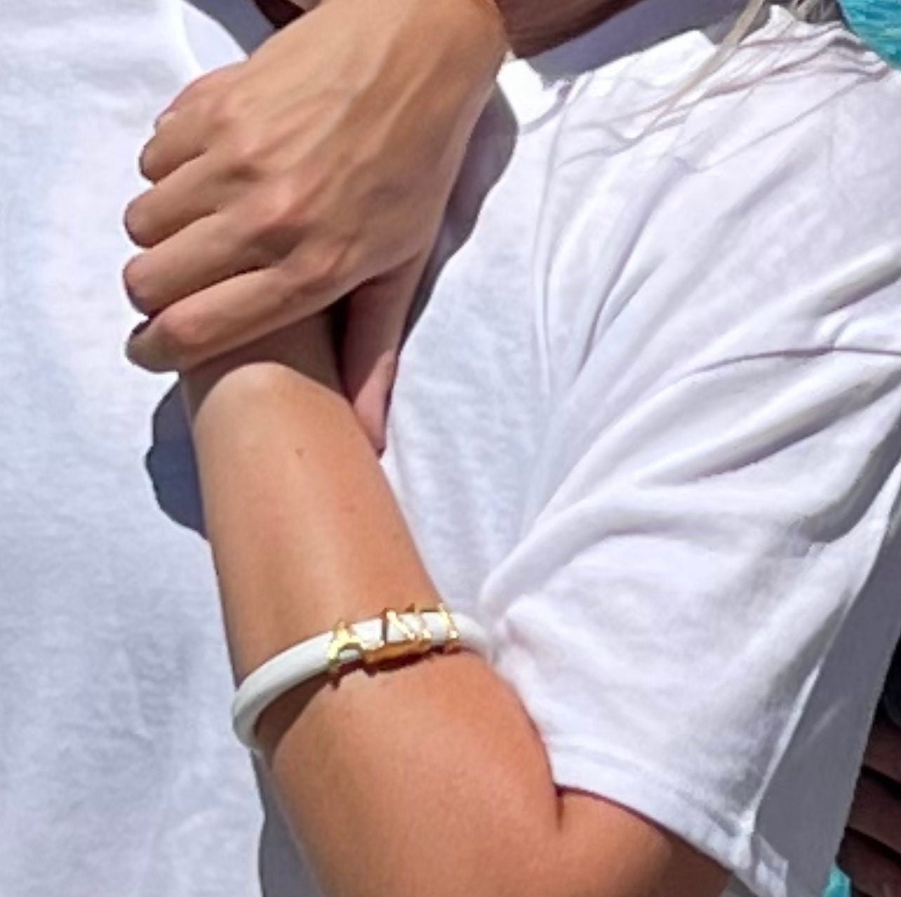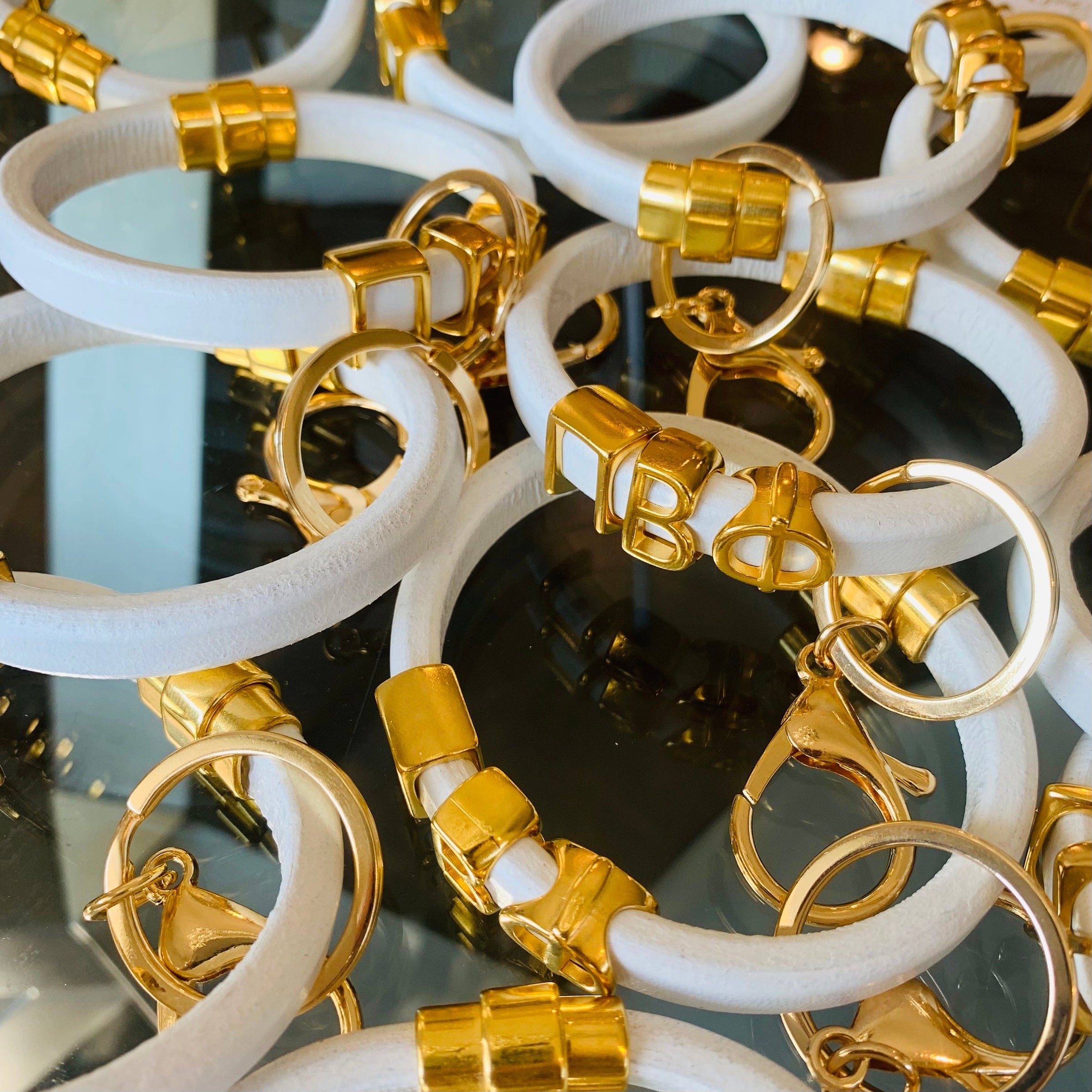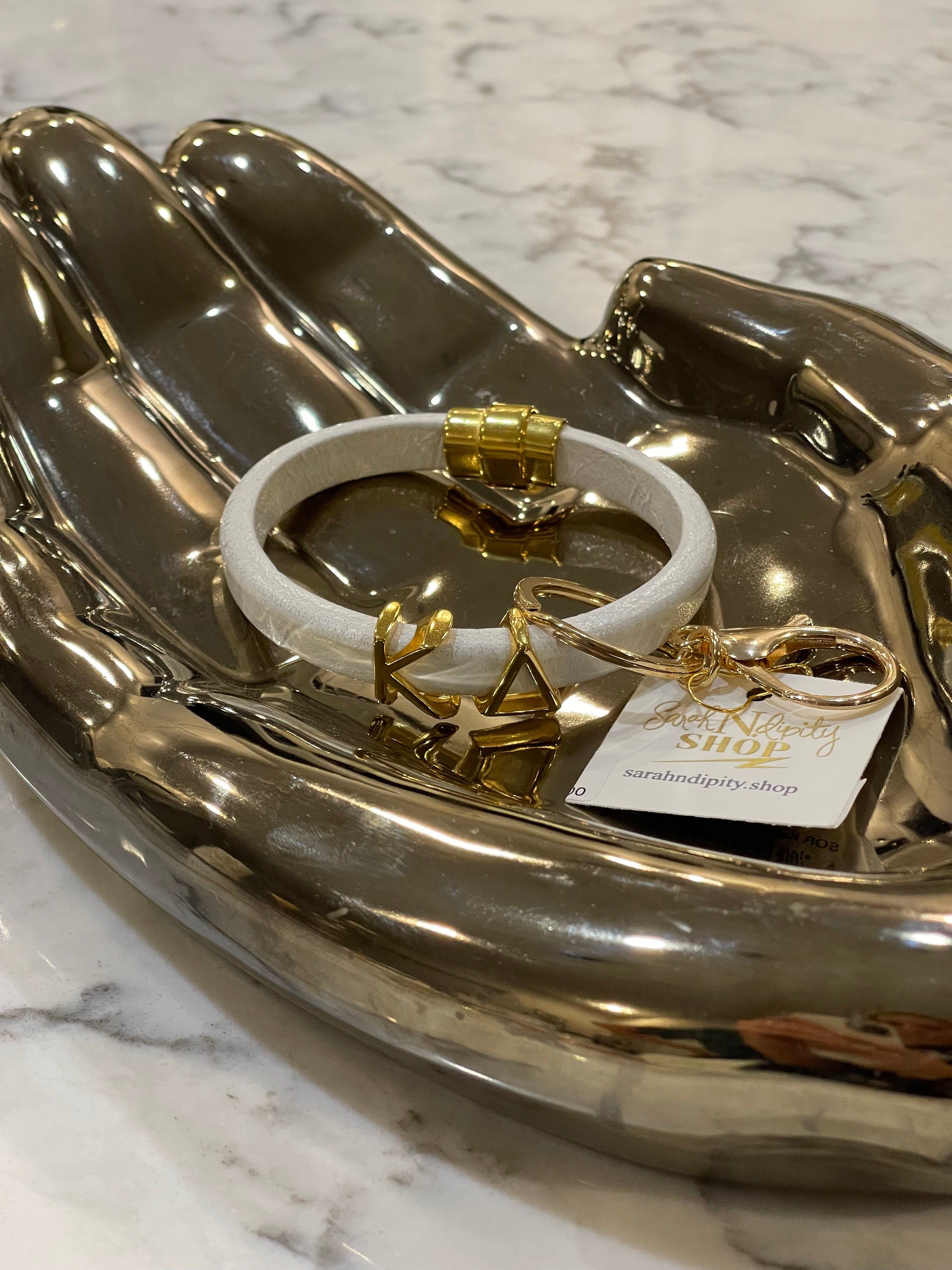 So charming! This white leather bracelet with gold magnetic clasp and gold Greek letter slide charms makes such a cute gift. This has a removable key ring for use as a pretty key chain OR bracelet.