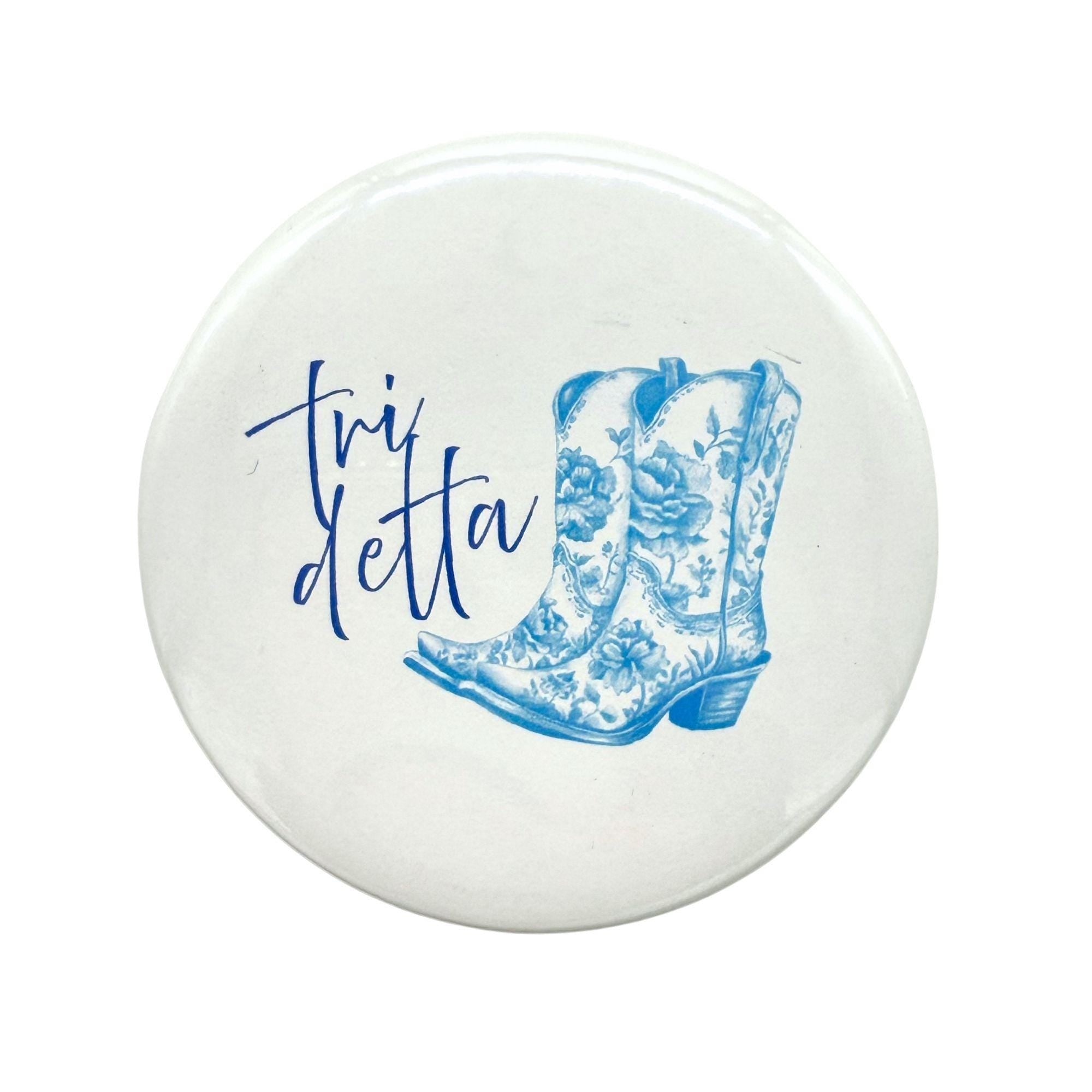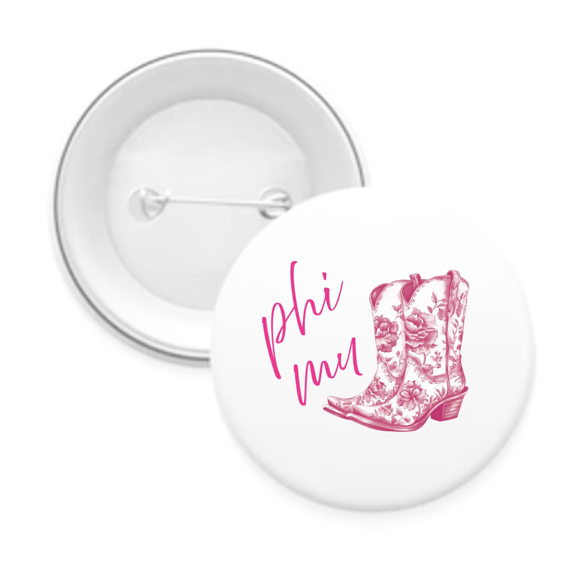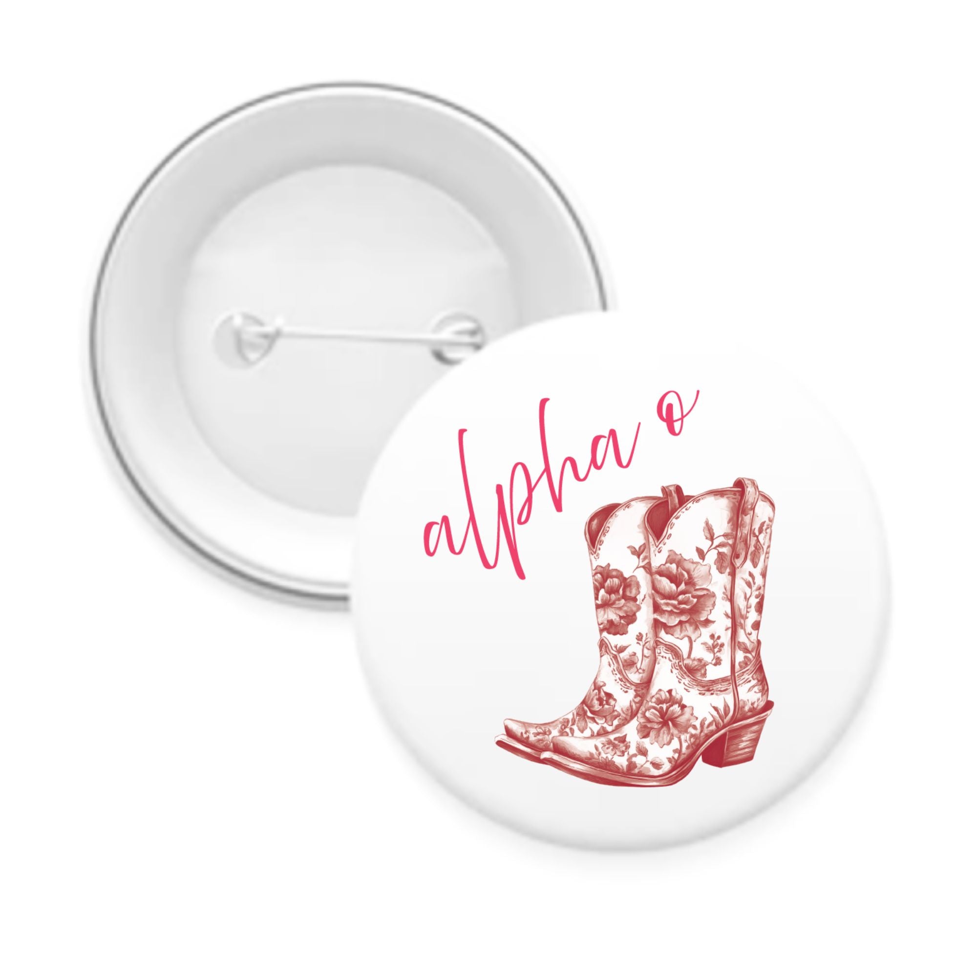 Show off your sorority spirit with these charming pin-back buttons, decorated with toile cowboy boots and your sorority’s name in a fun script. Choose between 2.25" and 3" sizes, each crafted in your sorority’s colors for a delightful cowboy-chic vibe. Ideal for game days, special occasions, gift-giving, or just adding a bit of fun to your daily style!